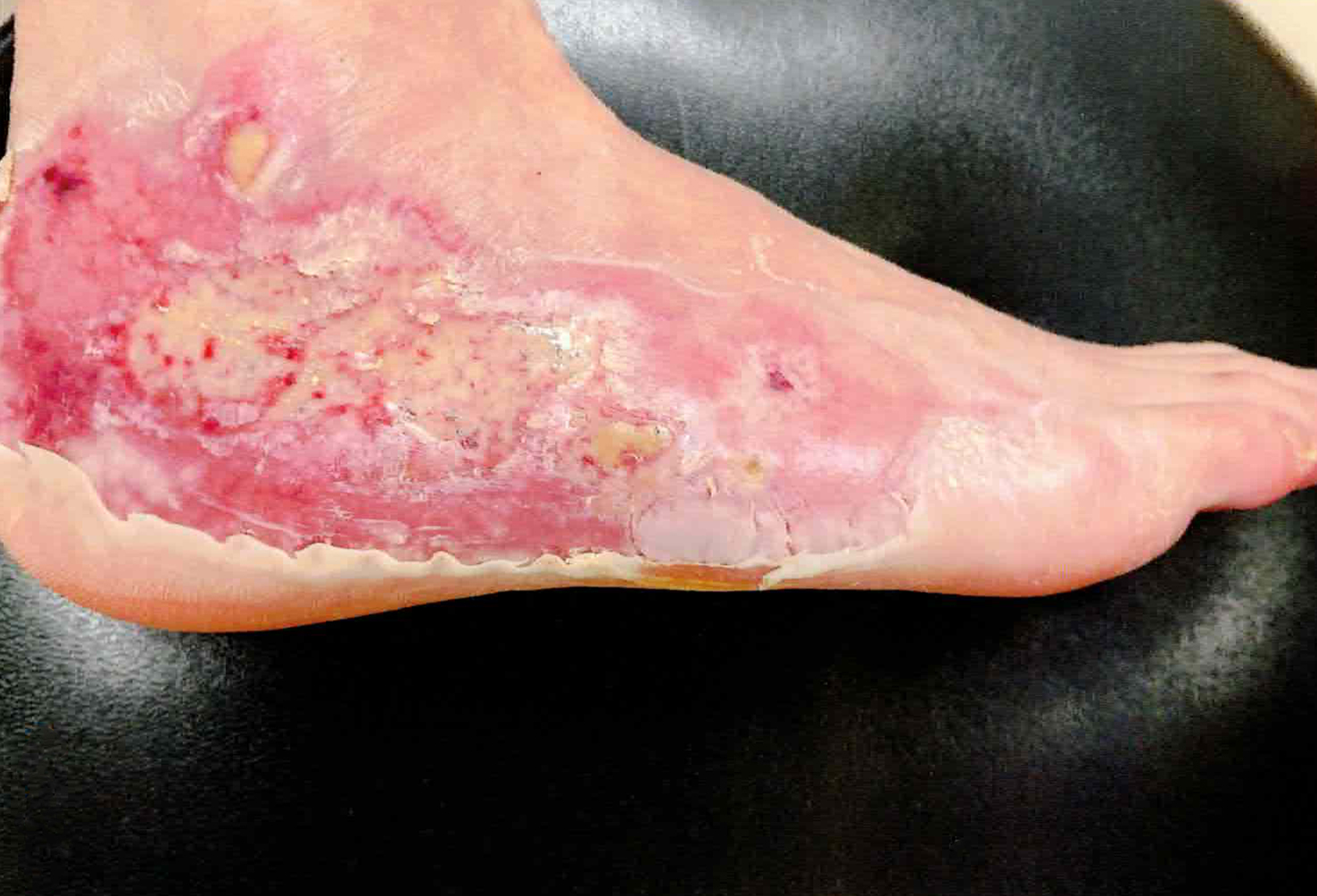 創部(傷)の深さは計ってはいないが、写真のとおり相当深く、皮膚欠損の大きさは直径約7~8センチほど。